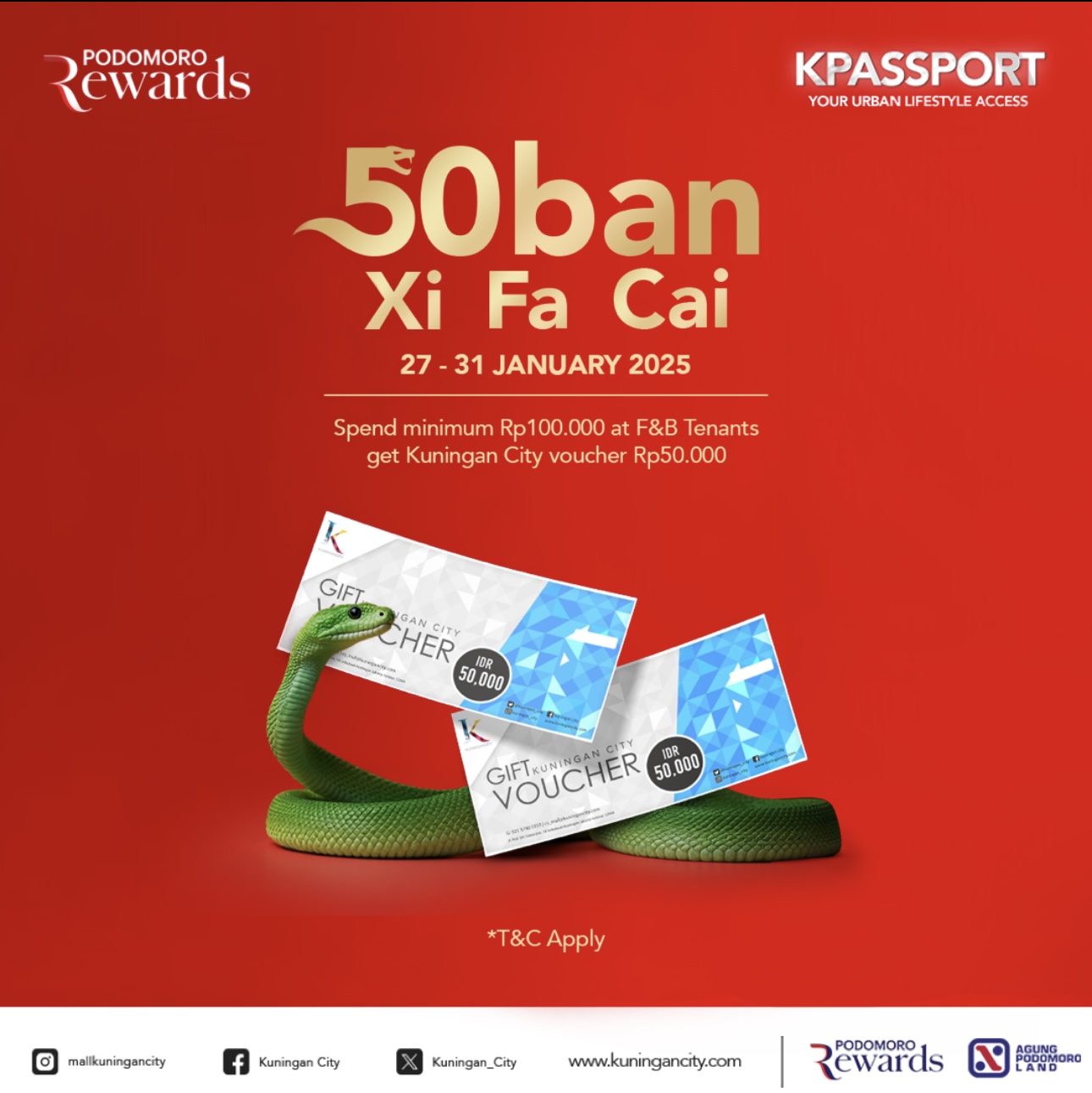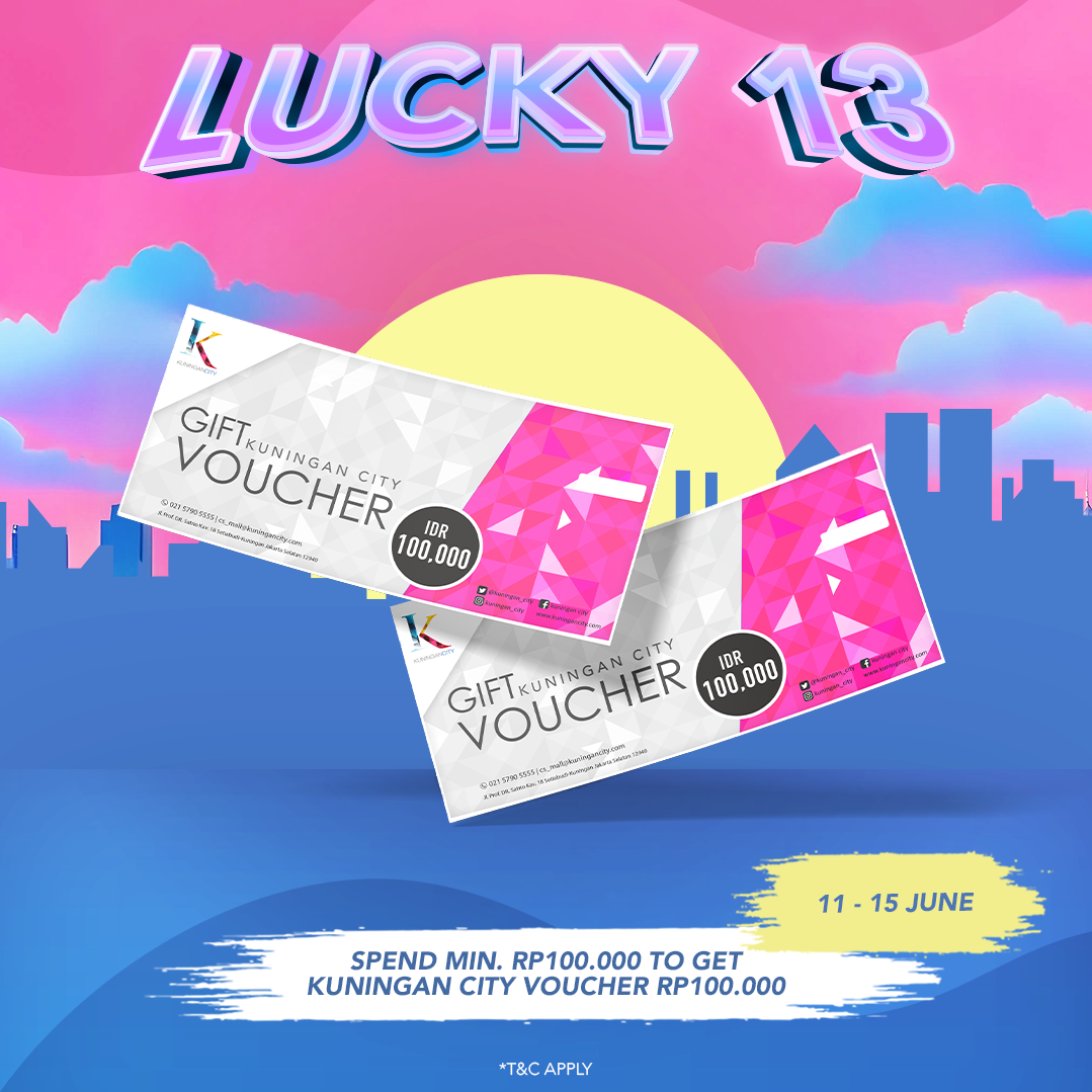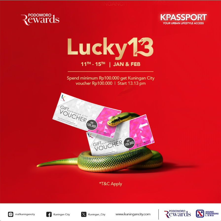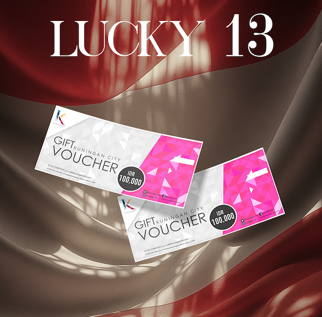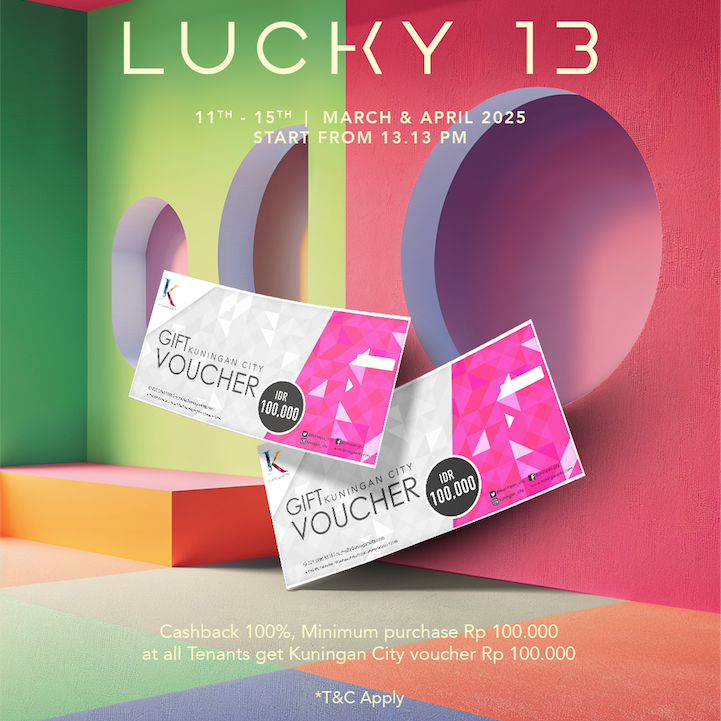 Spend minimum Rp100.000 get Kuningan City Voucher Rp100.000. Redeem starts at 13.13 pm.Valid at 11th - 15th, January and February.*t&...
